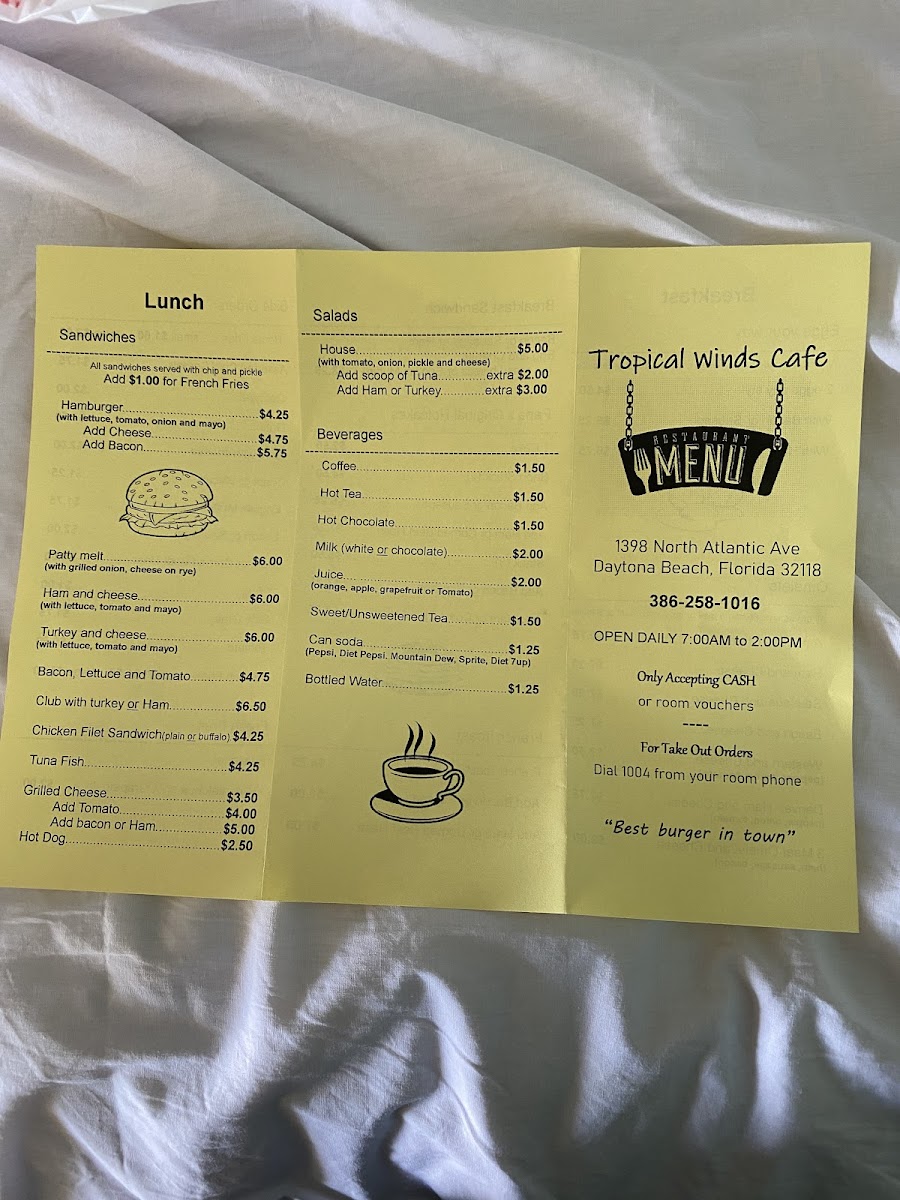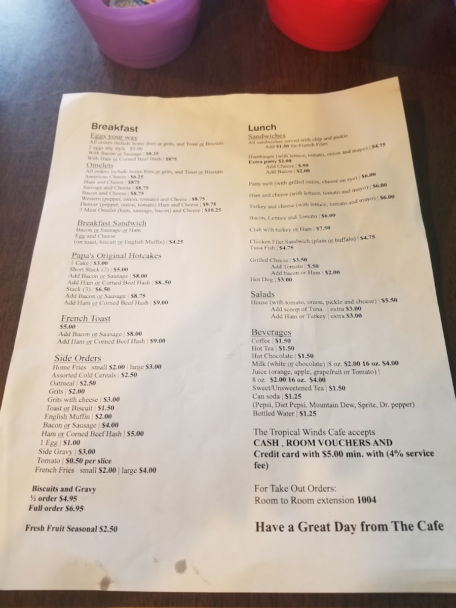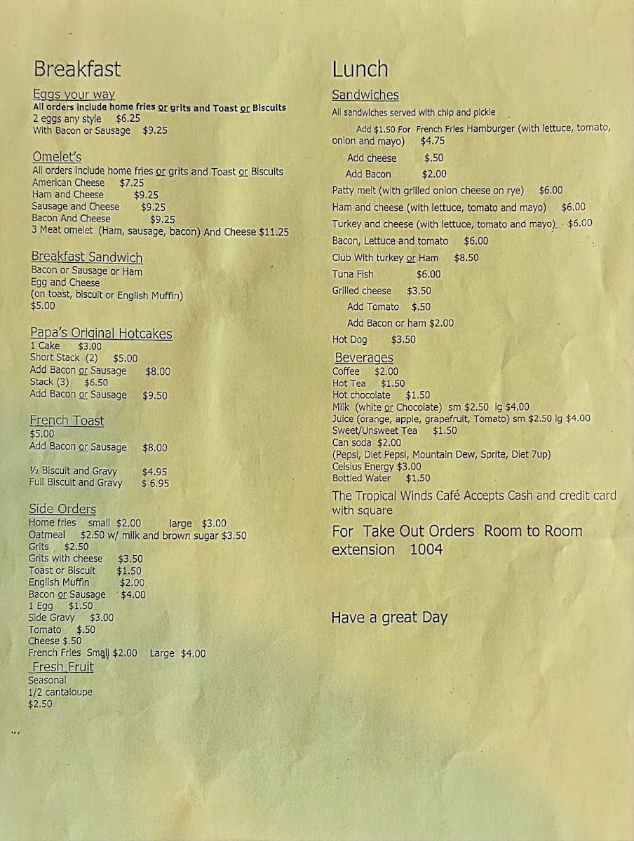 When you step into the relaxed vibe of Tropical Winds Cafe, you’ll be greeted by a menu full of flavorful dishes that are perfect for anyone craving fresh, beachside bites. Tropical Winds Cafe Menu offers a variety of options ranging from light snacks to hearty meals, all designed to satisfy your hunger while soaking in the stunning views of Daytona Beach. Whether you're in the mood for a tropical smoothie, a savory sandwich, or a fresh seafood dish, this menu has something for every taste. Each item is crafted with care, using the freshest ingredients to bring out vibrant flavors that will leave you coming back for more. The casual and welcoming atmosphere makes it the ideal spot to enjoy delicious food and a refreshing drink, especially when you’re on the lookout for a quick and satisfying meal in Daytona Beach.